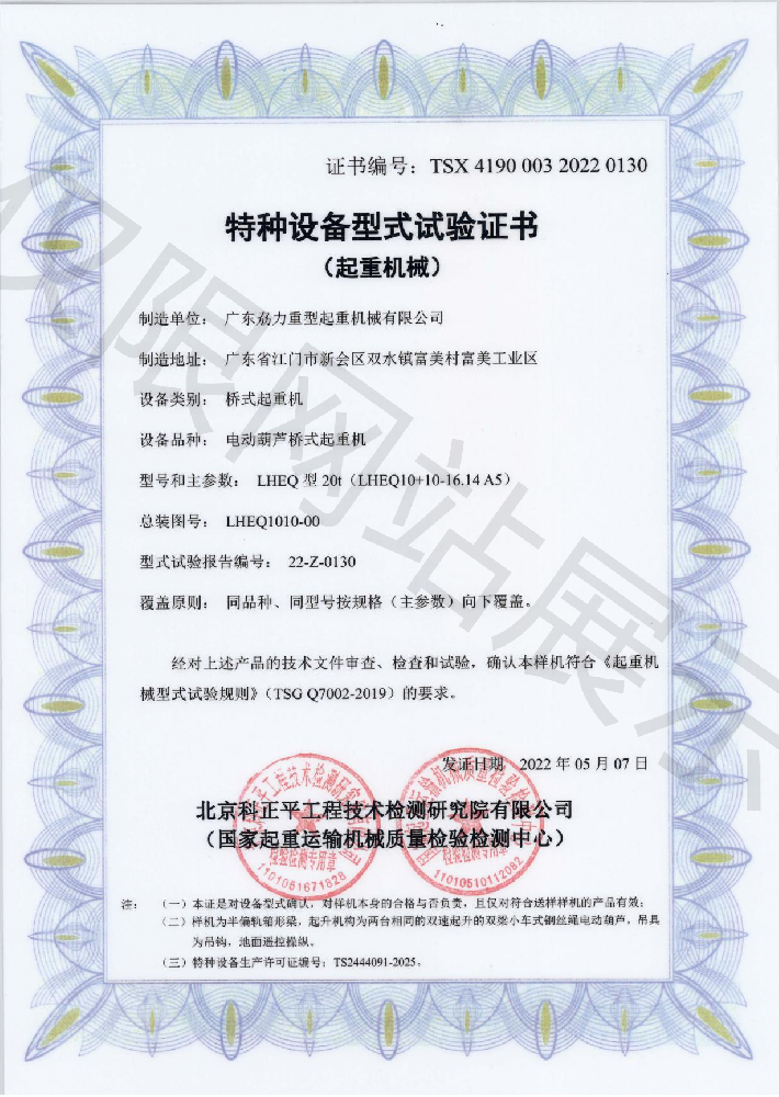 特種設(shè)備型式試驗(yàn)證書--電動(dòng)葫蘆橋式起重機(jī)